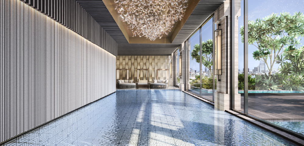 The podium garden landscape is imagined with the quiet charm of English country landscapes, envisioned as a landscape woven with water, foliage and open space, shaped by Sitetectonix, the acclaimed Singapore-based studio known for creating immersive, nature-led environments that balance crafted structure with gentle softness. Reflective pools, floating decks, shaded pavilions and wooded pockets will come together to create a natural sense of movement and contemplation. This elevated landscape is envisioned to become the development’s green centrepiece, a calming counterpoint to the energy of the city below, offering future residents an experience of seclusion and serenity.