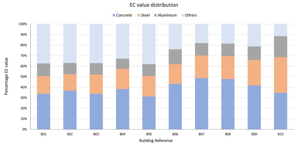 Figure 2: Percentage of EC attributed to concrete, steel and aluminium