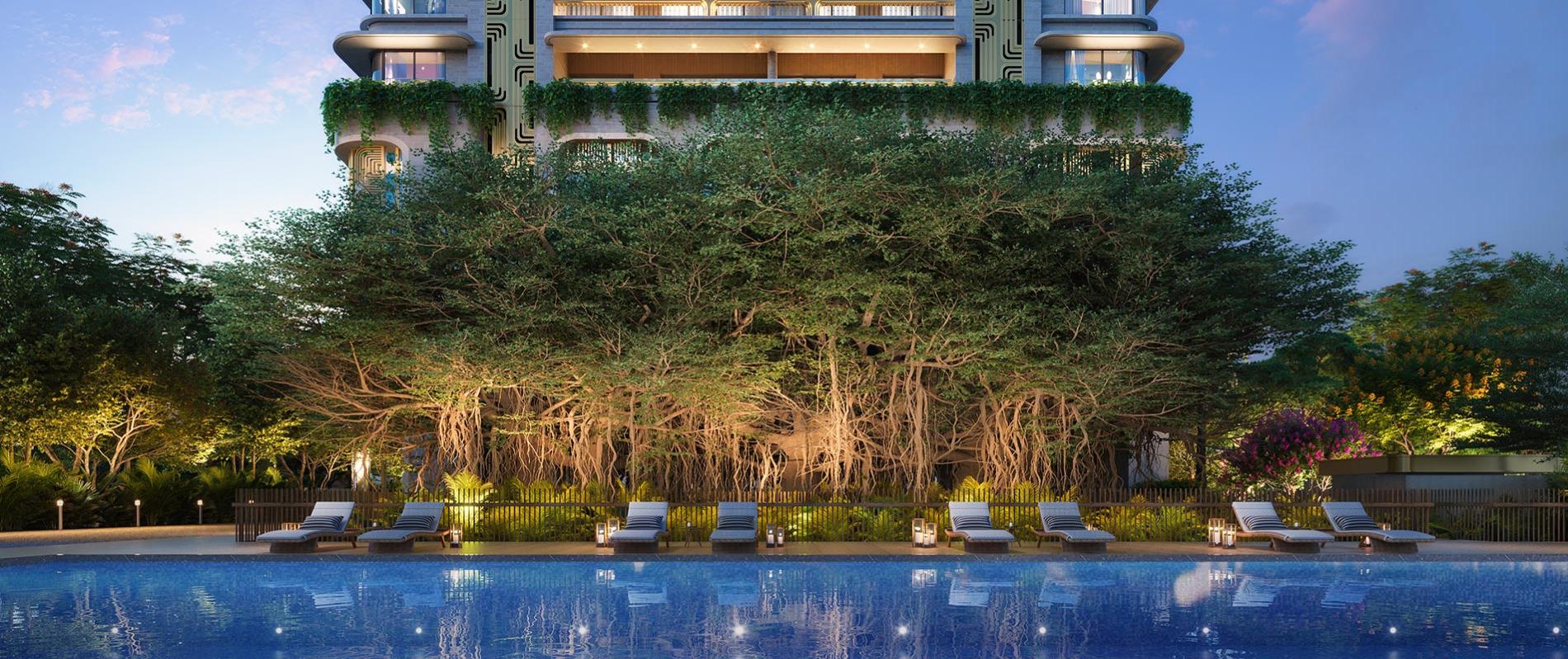Designed by world-renowned Singapore based firm, Sitetectonix, your landscape soulfully stretches across 40,000 sq. ft., raising a toast to nature’s endurance - a vision built around two majestic banyan trees which have called this site home for decades.